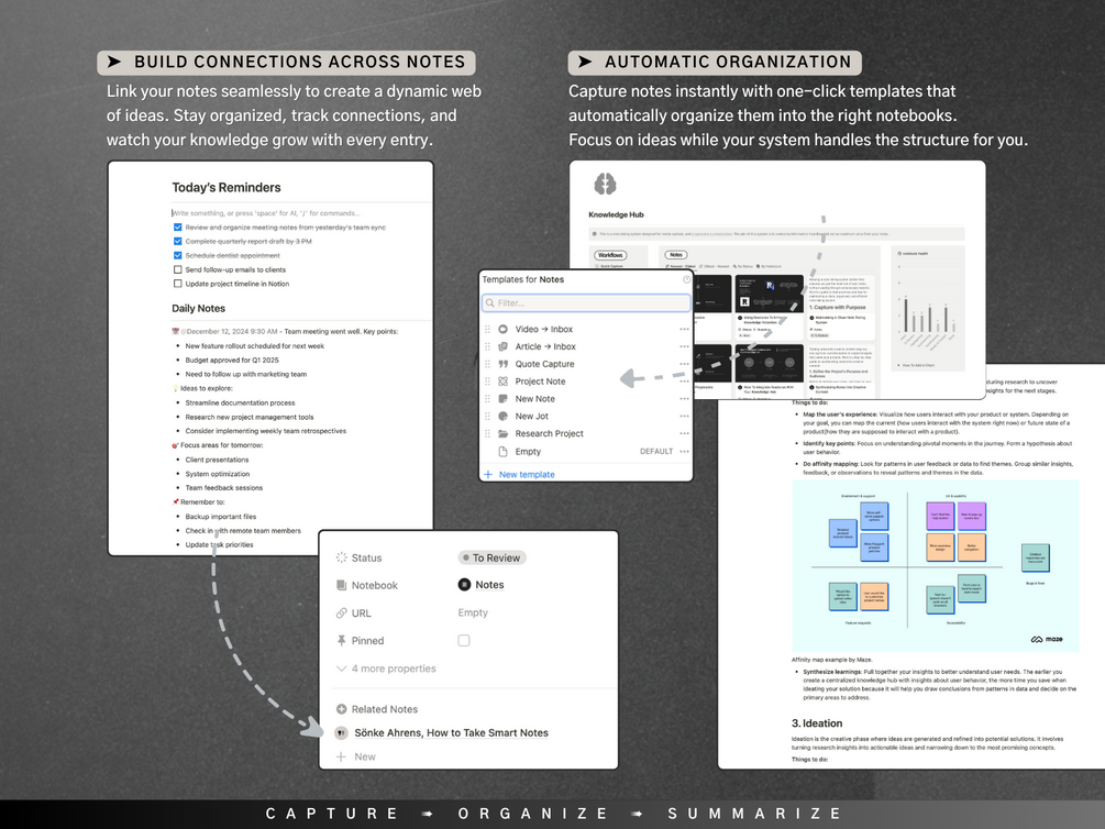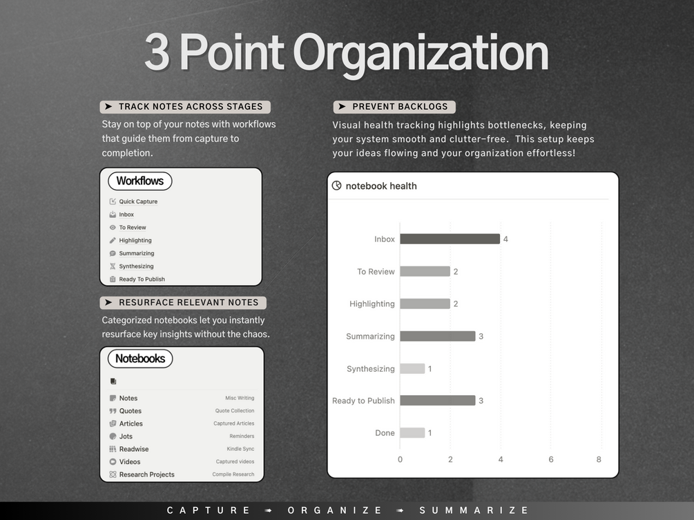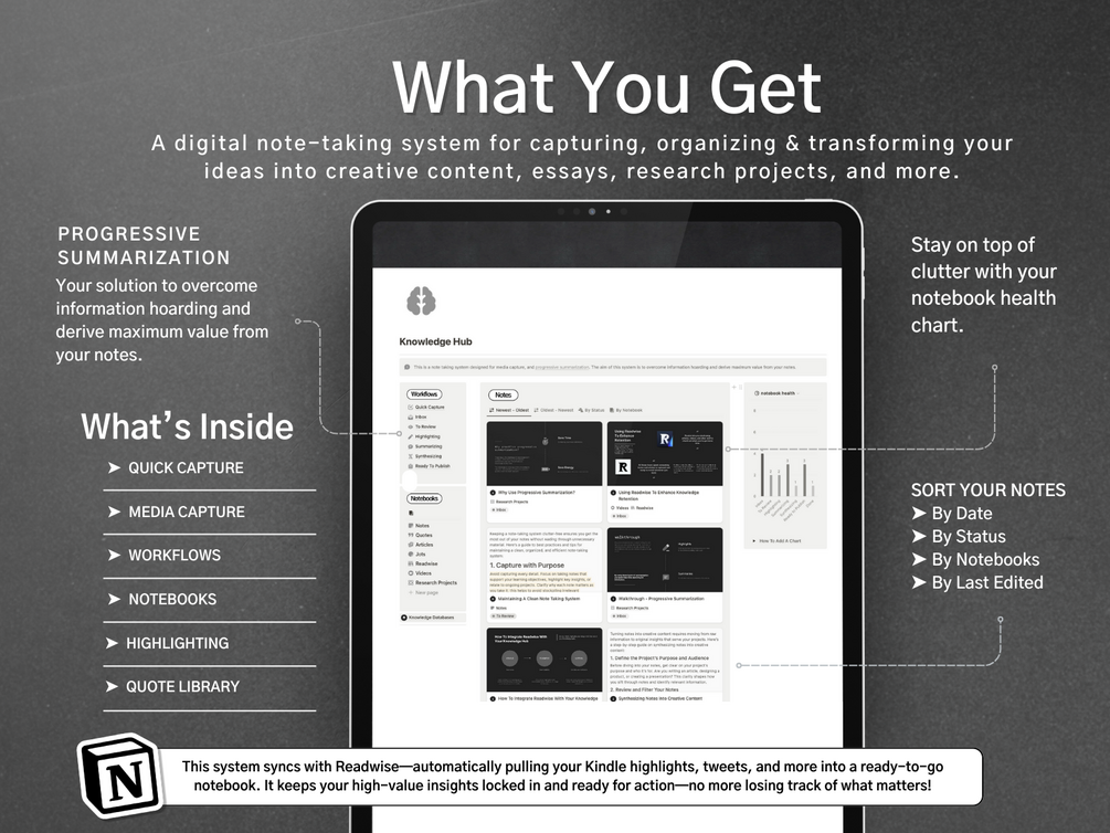 This Notion system is perfect for content creators, researchers, students, and autodidacts who aim to elevate their writing and content by harnessing the power of progressive summarization.