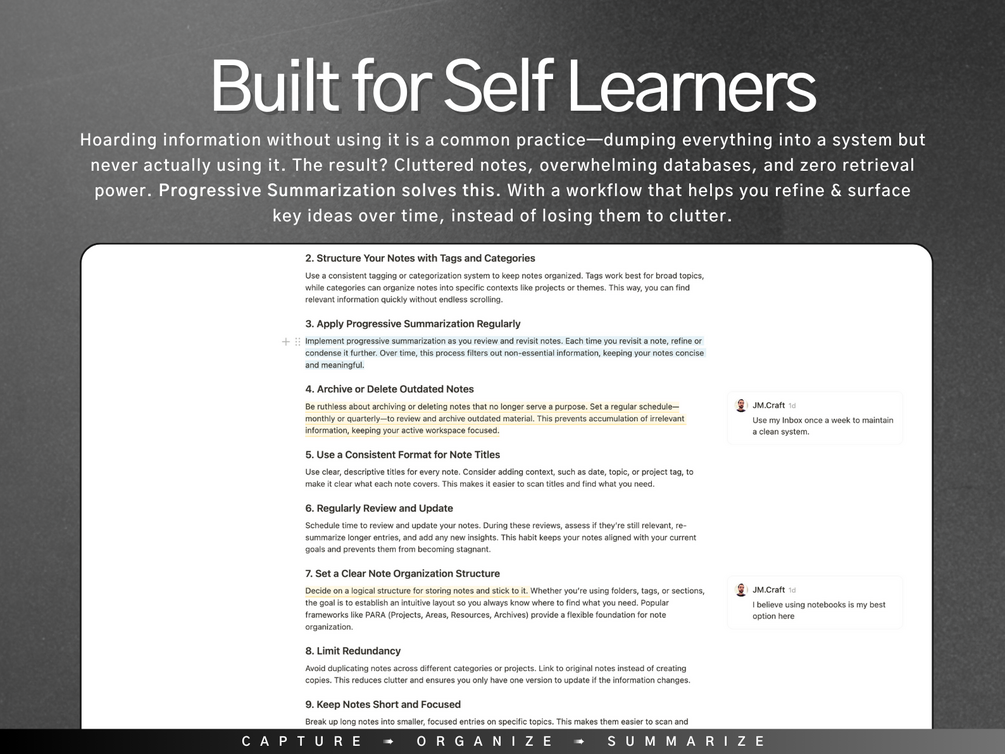 ✓ Progressive Summarization: Implement a multi-layered approach to note-taking that helps you distill information into original and actionable ideas. Start with broad summaries and refine them into concise, valuable pieces of content ready for publication. (Inspired by Thiago Forte of PARA - Building A Second Brain).
