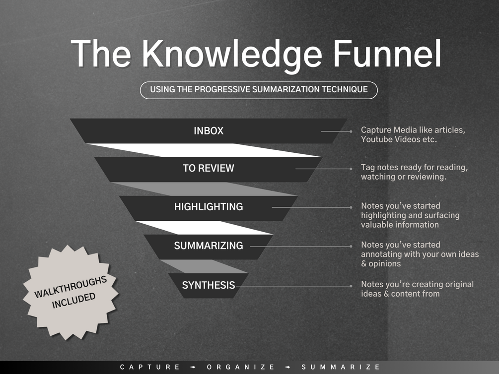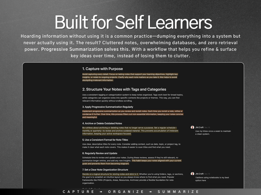 - Perfect for content creators, researchers, students, and autodidacts aiming to elevate their writing and content using progressive summarization.