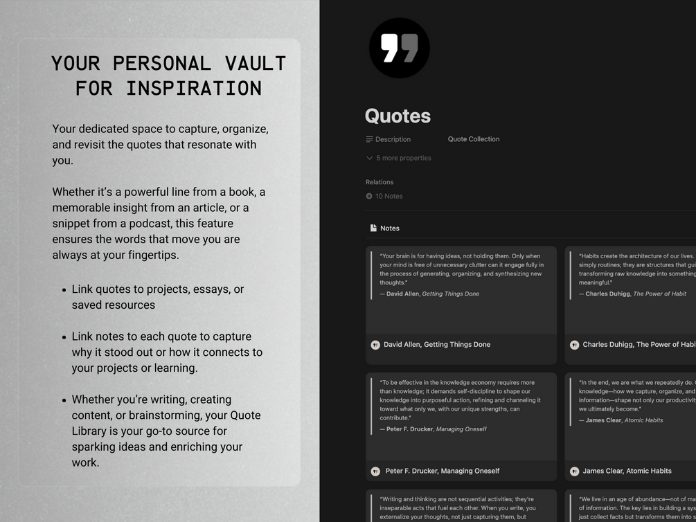 ☑︎ Quote Library: A dedicated space to capture, tag, and revisit quotes that inspire you. Perfect for creating a personal vault of timeless ideas and insights.
