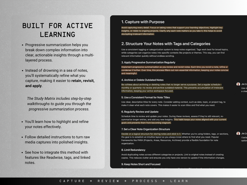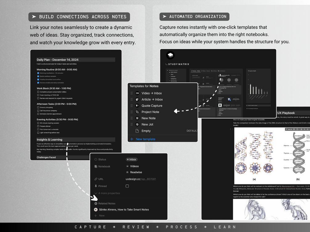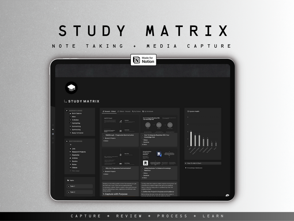The Study Matrix uses progressive summarization and a flexible three-entry-point structure (Workflow, Notebooks, and Topics) to ensure every piece of information you capture becomes part of a powerful, interconnected knowledge base.