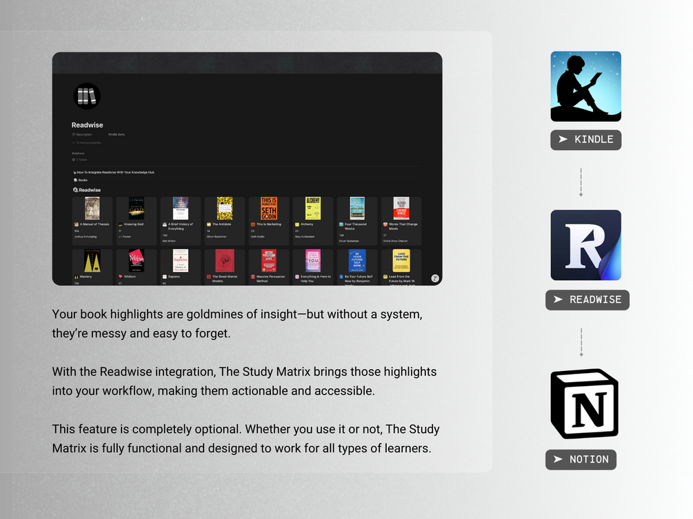☑︎ Leverage optional Readwise integration to bring your book highlights into your system for deeper retention and synthesis.